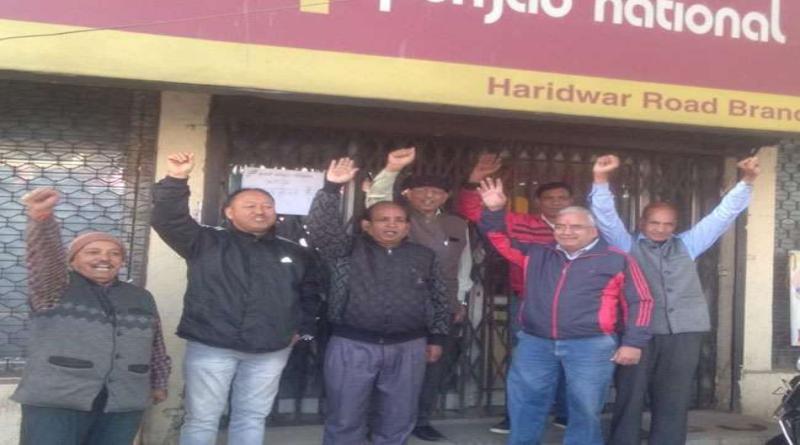 ऋषिकेश। ऑल इंडिया बैंक ऑफिसर्स एसोसिएशन के आह्वान पर नगर तथा आसपास क्षेत्र के सभी बैंक बंद रहे। अधिकारियों ने हरिद्वार रोड स्थित पीएनबी मुख्य शाखा के समक्ष प्रदर्शन किया। वहीं, रुड़की सिविल लाइंस स्थित एसबीआई की मुख्य शाखा में प्रदर्शन करते बैंक अधिकारी।