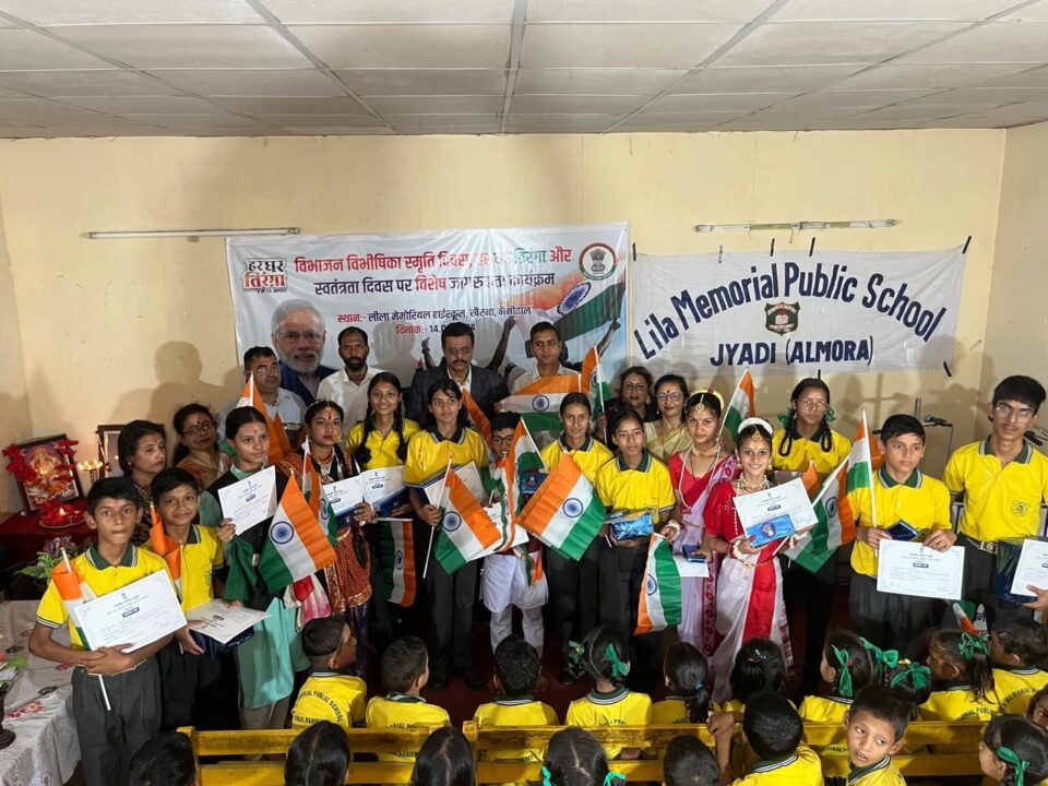 नैनीताल। केंद्रीय संचार ब्यूरो नैनीताल ने विभाजन विभीषिका स्मृति दिवस, हर घर तिरंगा और स्वतंत्रता दिवस पर एक विशेष जागरूकता कार्यक्रम का आयोजन किया। अल्मोड़ा जिले के बाढ़ेछीना विकास खंड के अंतर्गत ग्रामसभा ज्याड़ी के लीला मेमोरियल पब्लिक स्कूल में कार्यक्रम का आयोजन किया गया। श्री कैंची धाम के उपजिलाधिकारी वीसी पंत कार्यक्रम में मुख्य अतिथि के तौर पर शामिल हुए। उन्होंने कहा कि इस तिरंगे की शान में कोई कमी ना आने पाए, हर घर तिरंगे का यही पैगाम है।