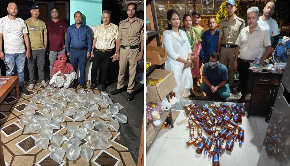जानकारी के अनुसार आबकारी टीम ऋषिकेश एवं जनपदीय प्रवर्तन दल देहरादून टीम द्वारा ऋषिकेश क्षेत्र के चंद्रभागा एवं चंद्रेश्वर नगर में शराब बिक्री की सूचना पर छापेमारी करके 1 पेटी देसी शराब माल्टा के साथ रमिता निवासी चंद्रेश्वर नगर एवं डेढ़ पेटी विदेशी शराब कमलेश जोशी निवासी चंद्रभागा से बरामद की गई। दोनों अभियुक्तों के विरुद्ध आबकारी अधिनियम के अंतर्गत मुकदमा पंजीकृत किया गया।वहीं दूसरी आबकारी टीम ऋषिकेश द्वारा देर रात मनसा देवी ऋषिकेश क्षेत्र में 56 पाउच के भीतर भरी 84 लीटर कच्ची शराब बरामद की गई। आरोपी मनसा देवी गुमानीवाला निवासी अमरजीत कौर पत्नी इंदर सिंह के खिलाफ आबकारी अधिनियम के तहत मुकदमा दर्ज किया गया है। छापेमारी करने वाली टीम में आबकारी निरीक्षक प्रेरणा बिष्ट, उप आबकारी निरीक्षक उमराव राठौर, प्रधान आबकारी सिपाही, अर्जुन सिंह, आशीष प्रकाश, हेमंत, राकेश, दीपा ,आशीष चैहान सम्मिलित रहे।