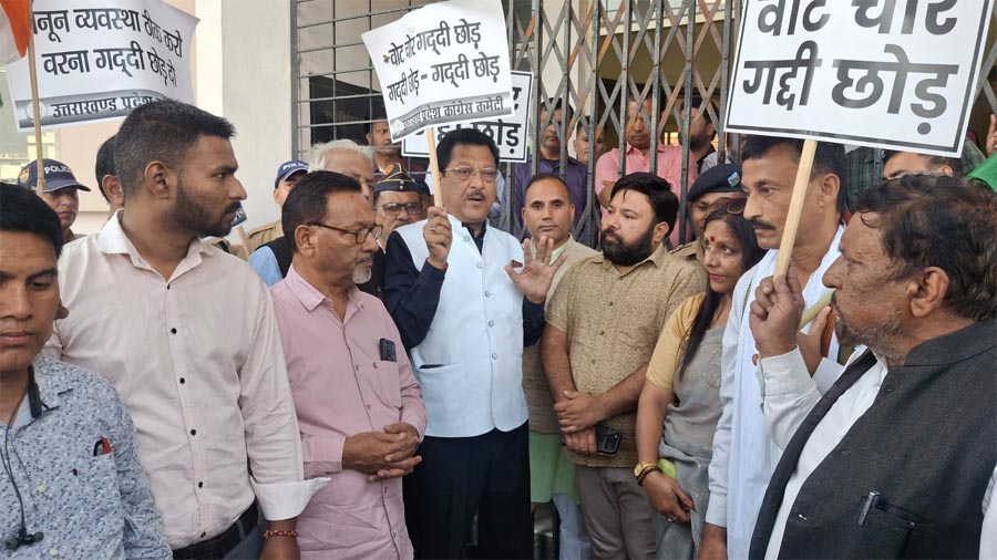 देहरादून। देशव्यापी वोट चोर गद्दी छोड़ अभियान के तहत आज उत्तराखंड प्रदेश कांग्रेस कमेटी के वरिष्ठ उपाध्यक्ष संगठन सूर्यकांत धस्माना के नेतृत्व में पार्टी के कार्यकर्ताओं ने रिंग रोड स्थित राज्य निर्वाचन आयोग कार्यालय का घिराव कर वहां जबरदस्त प्रदर्शन किया व प्रदेश के राज्यपाल लेफ्टीनेंट जनरल गुरमीत सिंह से तत्काल राज्य के राज्य निर्वाचन आयुक्त सुशील कुमार को बर्खास्त करने की मांग की। अपने पूर्व घोषित कार्यक्रम के अनुसार काफी संख्या में कांग्रेस कार्यकर्ता प्रदेश उपाध्यक्ष संगठन सूर्यकांत धस्माना के नेतृत्व में साढ़े बारह बजे राज्य निर्वाचन आयोग कार्यालय पहुंचे जहां कार्यक्रम की सूचना पा कर पहले ही बड़ी संख्या में सीओ रायपुर के नेतृत्व में भरी पुलिस बल तैनात था। आयोग के कार्यालय के मुख्य द्वार से धस्माना के नेतृत्व में कार्यकर्ता हाथों में तख्तियां लिए राज्य निर्वाचन आयुक्त के कार्यालय की ओर बड़े जहां सीओ रायपुर ने धस्माना को बताया कि राज्य निर्वाचन आयुक्त कार्यालय में उपस्थित नहीं है जिस पर धस्माना व अन्य कार्यकर्ताओं ने प्रदर्शन शुरू कर दिया और पूरा आयोग परिसर वोट चोर गद्दी छोड़ के नारों से गूंज उठा।
