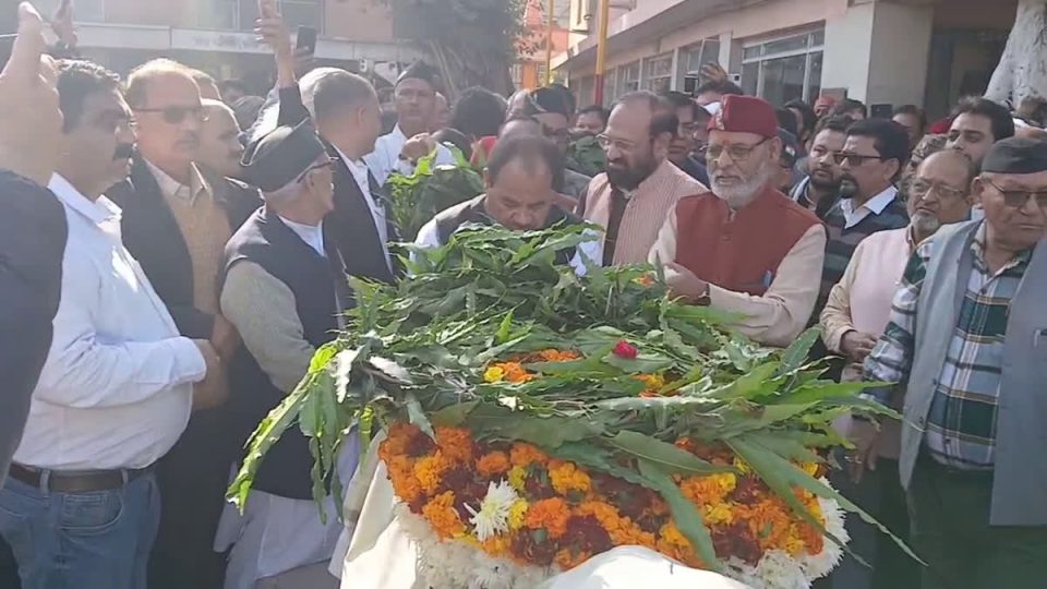 हरिद्वार। फील्ड मार्शल ने नाम से प्रसिद्ध राज्य आंदोलनकारी और पूर्व कैबिनेट मंत्री दिवाकर भट्ट का आज राजकीय सम्मान के साथ हरिद्वार के खड़खड़ी श्मशान घाट पर अंतिम संस्कार किया गया। दिवाकर भट्ट के बेटे ललित भट्ट ने उन्हें मुखाग्नि देकर नम आंखों से अंतिम विदाई दी। अंतिम संस्कार से पहले उनके घर से लेकर श्मशान घाट तक अंतिम यात्रा निकाली गई, जिसमें बड़ी संख्या में लोग शामिल हुए। राजनीतिक दलों के कई दिग्गज नेता भी दिवाकर भट्ट को श्रद्धांजलि देने हरिद्वार पहुंचे थे। मुख्यमंत्री पुष्कर सिंह धामी की ओर से जिलाधिकारी मयूर दीक्षित और एसएसपी प्रमेंद्र सिंह डोबाल ने उनके प्रार्थिव शरीर पर पुष्पचक्र अर्पित कर श्रद्धांजलि दी।