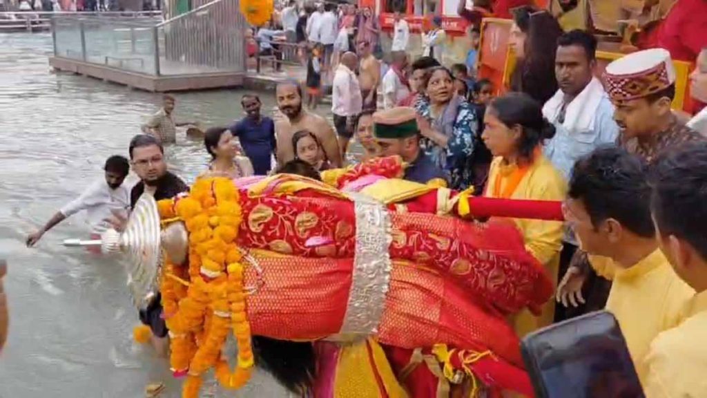 हरिद्वार। भगवान विश्वनाथ-मां जगदीशिला की 27 वीं डोली यात्रा हरिद्वार पहुंची। यात्रा में शामिल लोगों ने हरकी पैड़ी स्थित ब्रह्मकुंड पर गंगा पूजन किया और डोली को गंगा स्नान कराया गया। गंगा स्नान कर कर डोली यात्रा रवाना हो गई। हर वर्ष देव डोली यात्रा की अगुवाई पूर्व कैबिनेट मंत्री, मंत्री प्रसाद नैथानी करते हैं। पारंपरिक ढोल नगाड़ों की थाप पर सैकड़ों श्रद्धालुओं के साथ पहुंची डोली यात्रा का हरकी पैडी पर जोरदार स्वागत किया गया और पूरे विधिविधान के साथ डोली को मां गंगा में स्नान कराया गया।