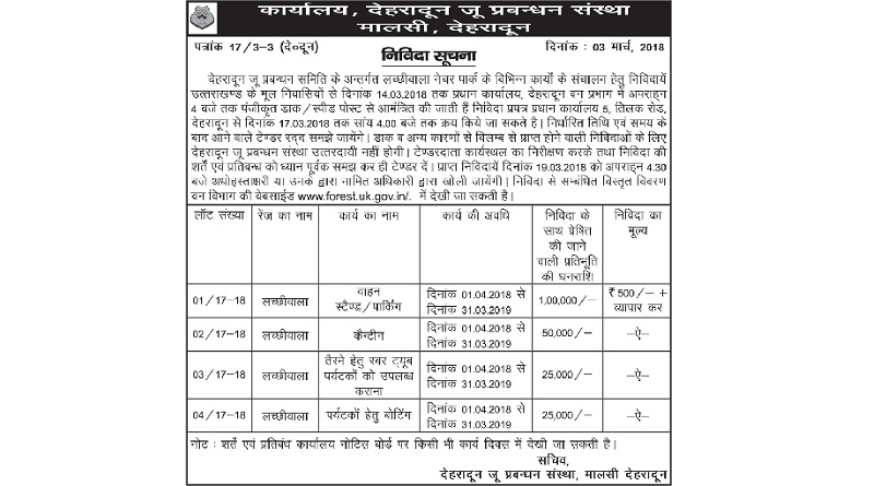 बीती 4 मार्च को देहरादून के एक प्रमुख समाचार पत्र में प्रकाशित कराई गई निविदा सूचना में लच्छीवाला पिकनिक स्पाट पर वाहन स्टैण्ड/पार्किंग, कैन्टीन, रबर ट्यूब, बोटिंग जैसे कार्यों हेतु निविदा आमंत्रिण की गई है जिसमें स्पष्ट तौर पर उल्लेख किया है कि उत्तराखण्ड के मूल निवासियों से निविदा आमंत्रित की जा रही है। उक्त पर्यटक स्थल वन विभाग के नियंत्रणाधीन आता है।